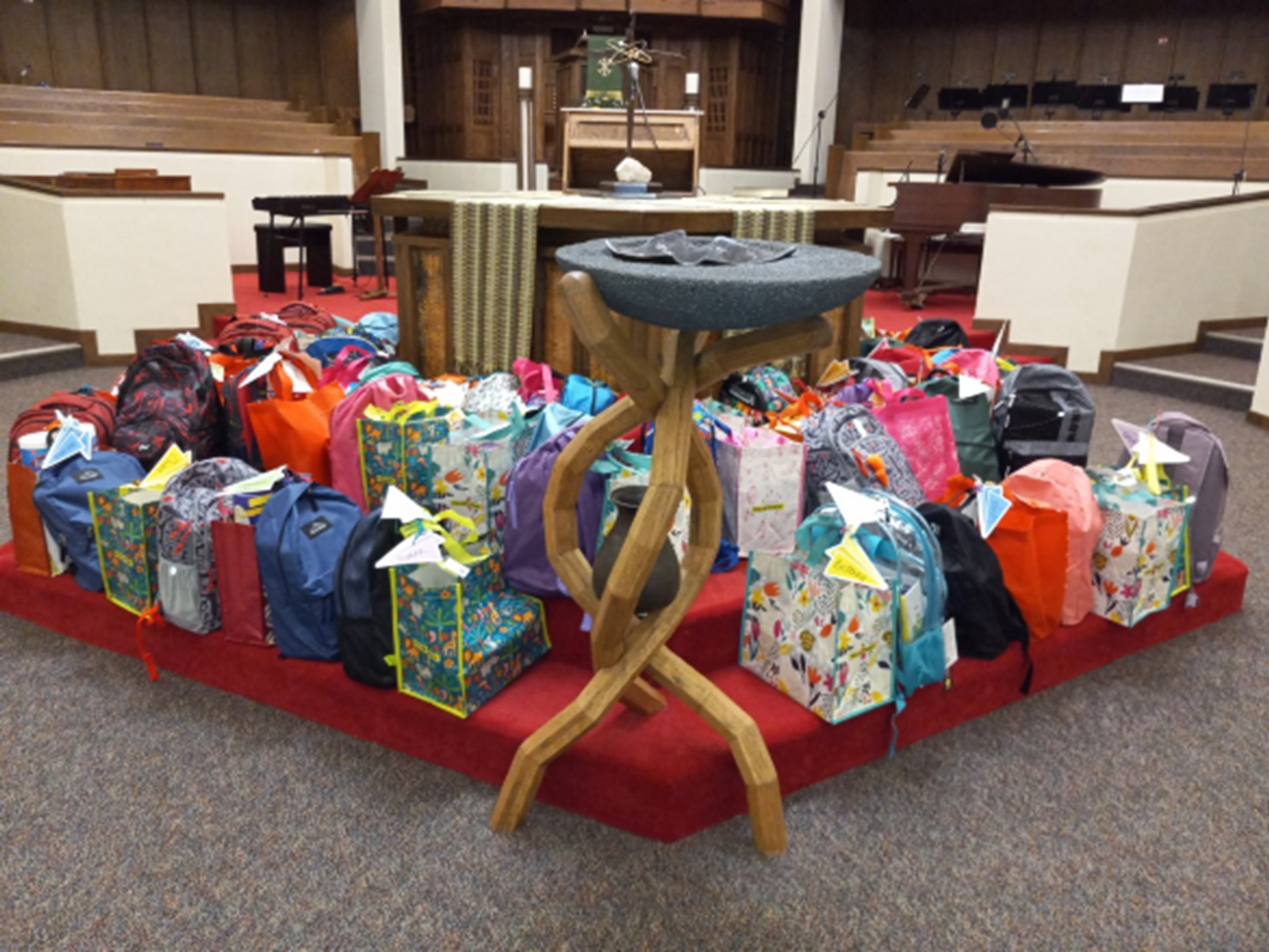 The seating arrangement is stadium-like; there are pews, but tiered seating allows everyone a clear view of the room. Parkway also has kneeling benches at each pew, an unusual feature in a Presbyterian Church. Those who wish to are encouraged to kneel for the prayers during worship.